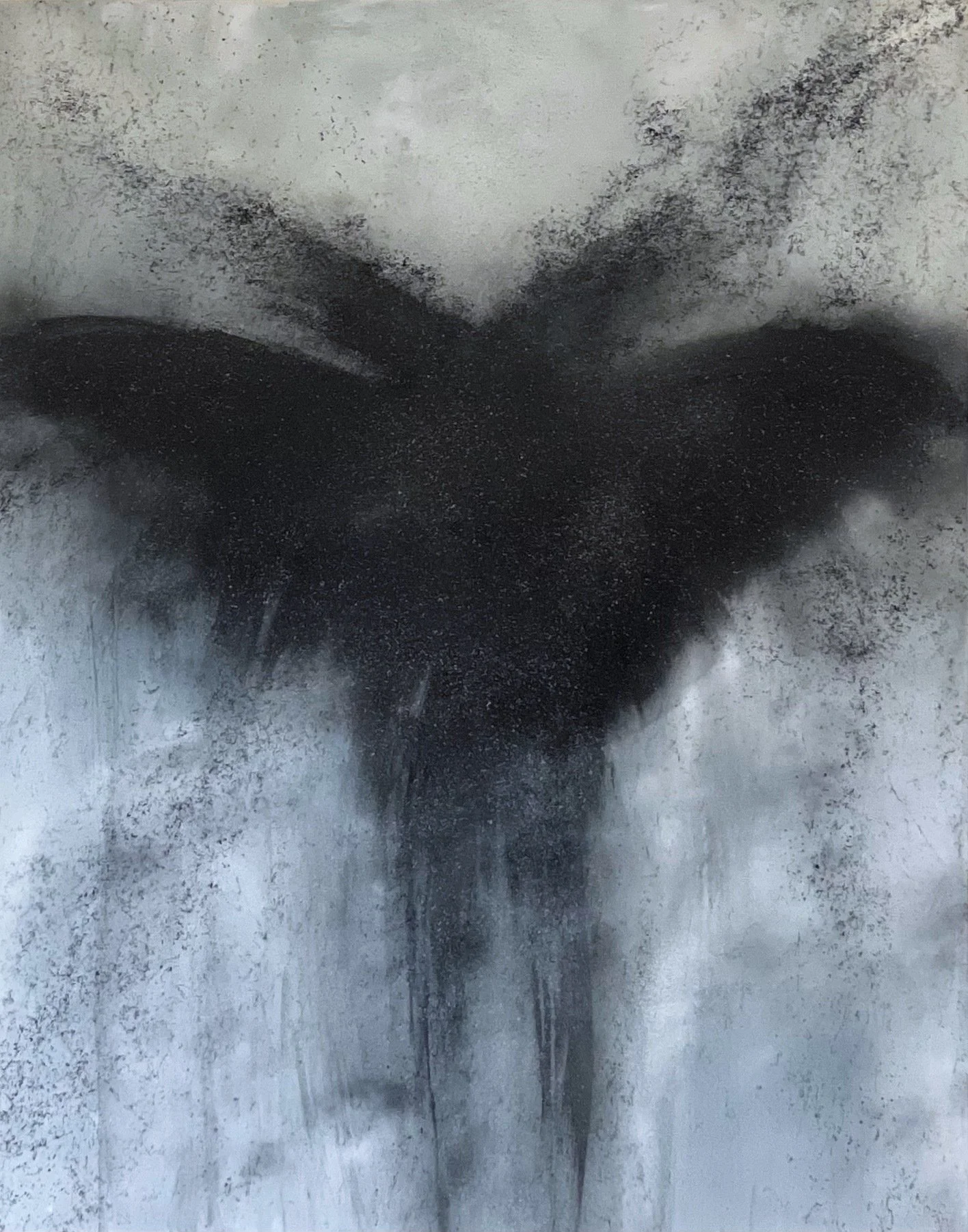 Rorschach' is a textured abstract piece named after the iconic Rorschach inkblot test, reflecting its symmetrical, ambiguous composition that invites personal interpretation. The central form, a bold black shape with a butterfly-like silhouette, is set against a light gray background, surrounded by splatters and drips in black and white, creating a sense of depth and movement. The textured surface adds a raw, organic quality, encouraging viewers to project their meanings onto the abstract forms, much like the psychological test.